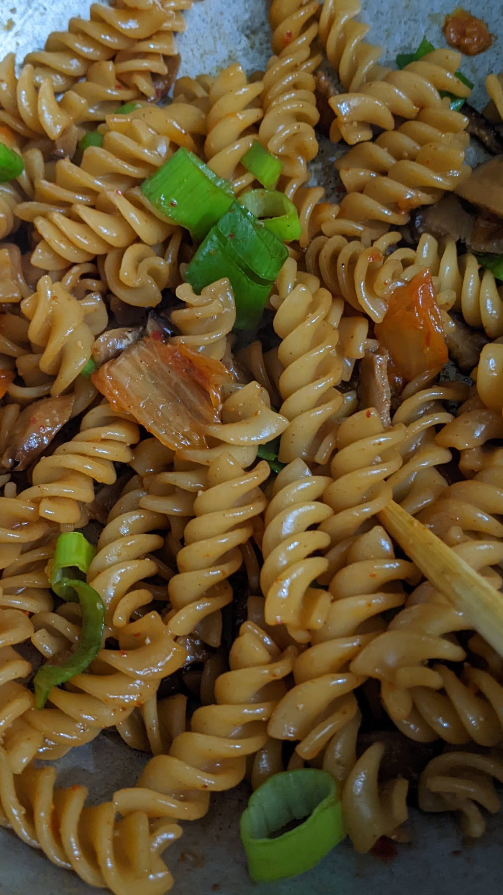 La recette express : Pâtes de votre choix - Sauce bulgogi - Crème fraîche - Champignons shiitake - oignons verts