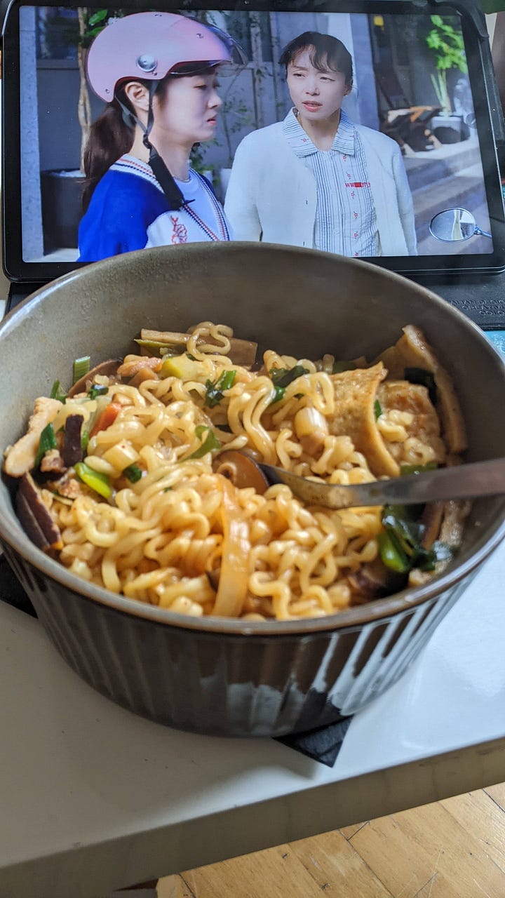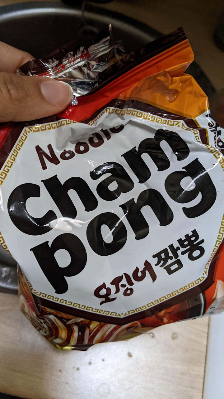 J'ai testé les nouilles instantanées jjamppong et... j'ai encore la langue engourdie. Pour adoucir un peu (un peu), j'ai ajouté du poisson séché, des champignons shiitake et de l'oignon vert. Accompagné d'un verre de makgeolli bien frais, ça passe mieux !